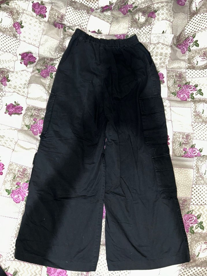Kadınlar için düğmeli detaylara sahip siyah bol kesim uzun kumaş pantolon. Rahat sentetik kumaştan, günlük sokak stiline uygun. Sorunsuz xs s m uyar