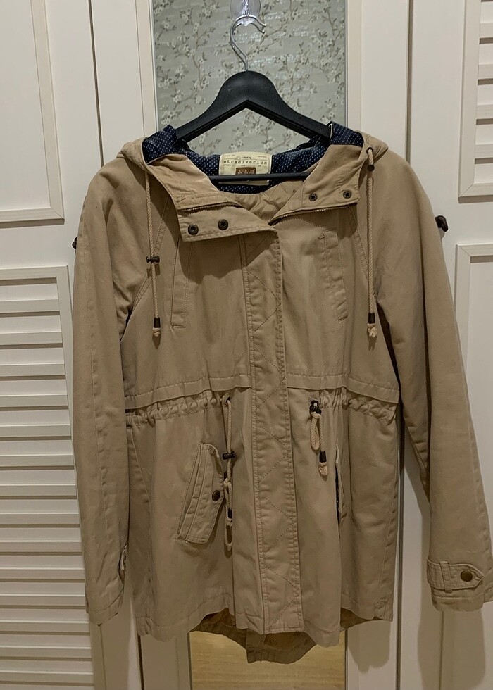 Stradivarius Parka Yeni gibidir 40 beden İncedir Şapkasının kumaşında puantiyeli desen ayrıntısı vardır⭐️