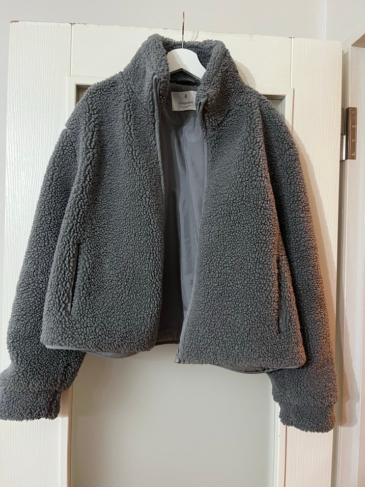 Yumuşak ve sıcak kumaştan, yüksek yakalı ve uzun kollu, gri renkte, kürk detaylı, bol kesim ve normal uzunlukta kadın ceket. Rahat ve trend görünüm sunar.