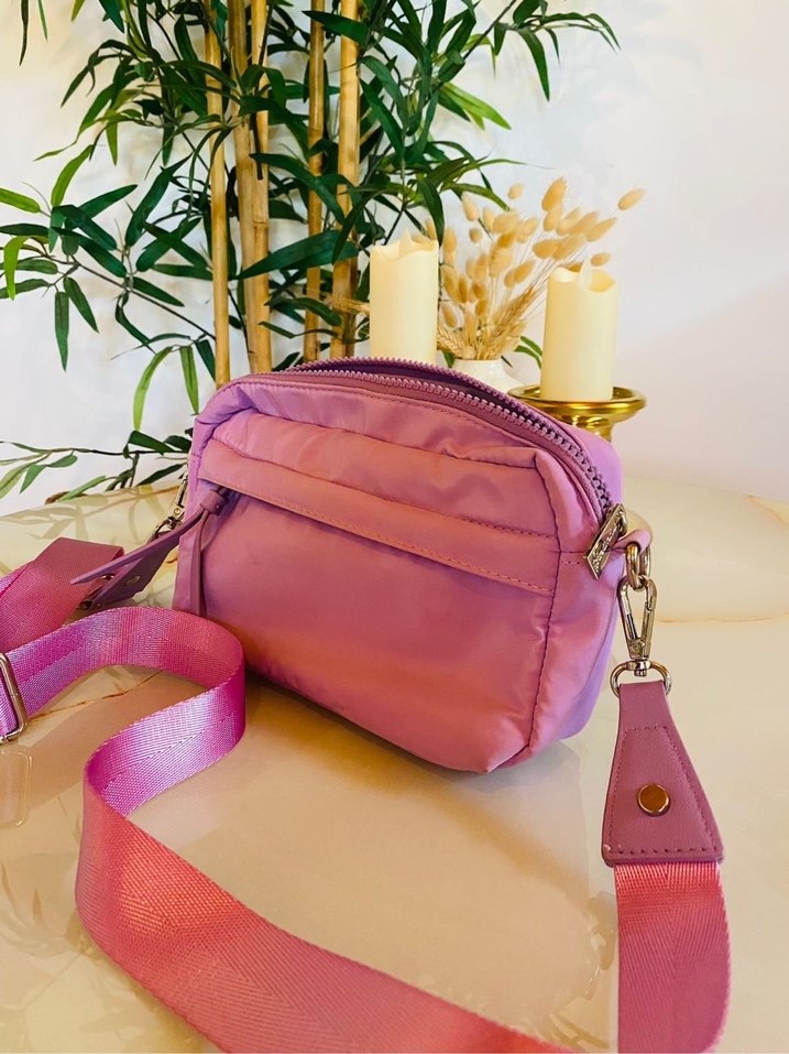 Pembe renkli, fermuarlı çapraz çanta, pastel tonlarda ve sentetik kumaştan, günlük sokak stili için uygun.