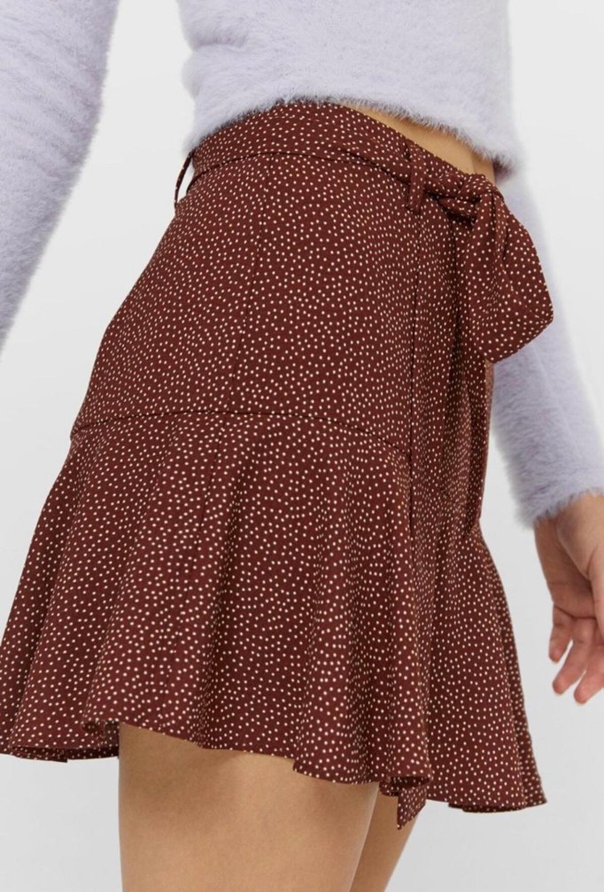 Kahverengi midi etek, bol kesim, volan detaylı ve puantiye desenlidir. Yumuşak sentetik kumaştan üretilmiş, rahat ve günlük kullanıma uygundur.