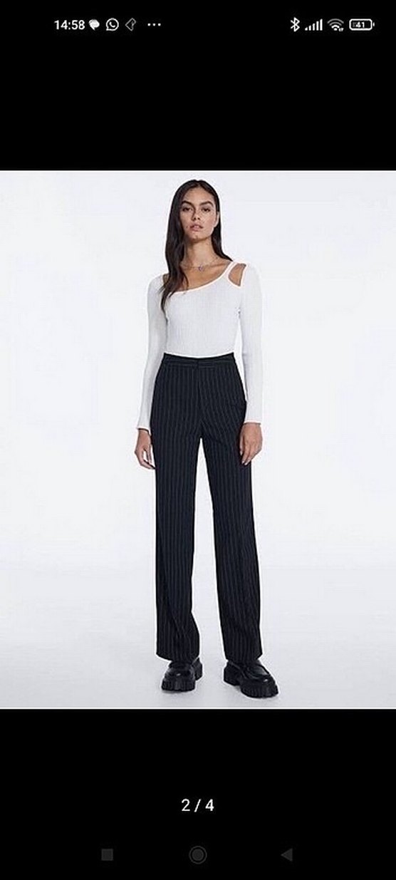 Stradivarius siyah çizgili, boru paça ve normal boyda kadın kumaş pantolon, ofis ve günlük sokak stiline uygundur. Geçen sezon olduğu için kemer takma alanı yok, tamamen görseldekinin aynısı. Bir kere giyildi.