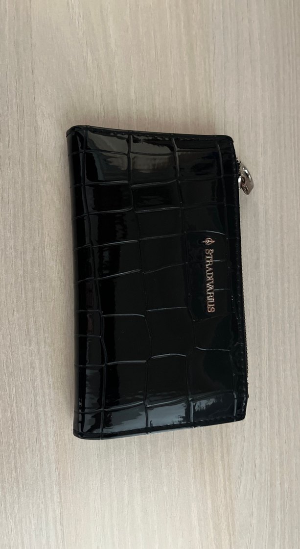 az kullanildi temiz Stradivarius marka siyah deri cüzdan, fermuarlı ve yılan derisi desenine sahip. Gotik tarzda, Paris esintili bir tasarım.