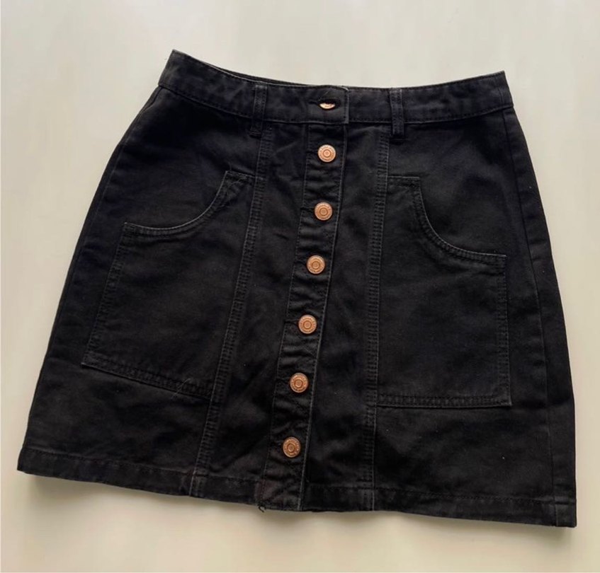 Düğmeli ön kısmı ve rahat kesimi olan siyah denim mini etek. Mini boyda, iki cep içerir. Günlük kullanıma uygundur.
