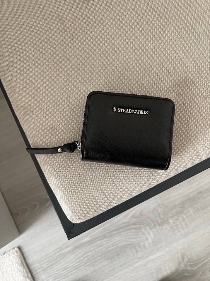 Stradivarius markalı siyah deri cüzdan, fermuarlı kapanışa ve minimalist baskılı tasarıma sahiptir. Ofis ve günlük kullanıma uygundur.