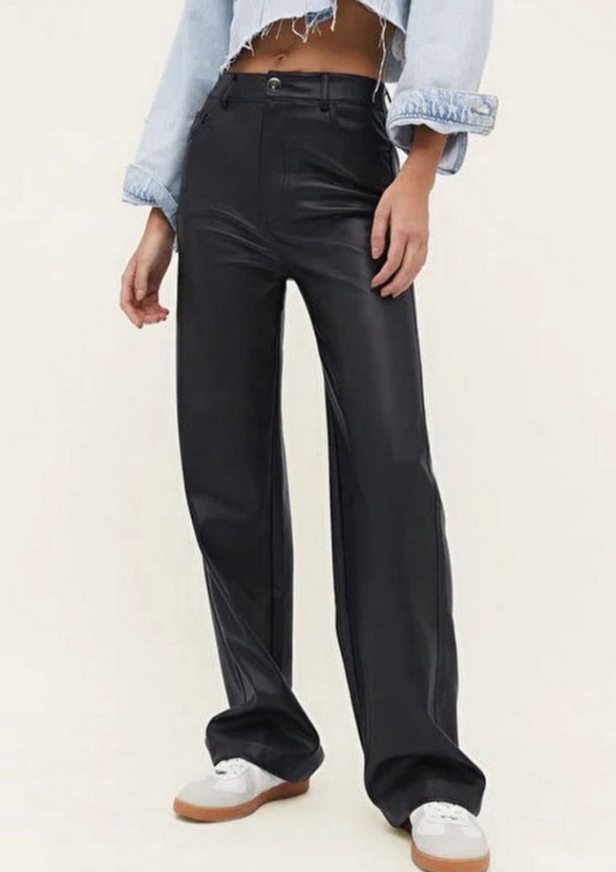 Siyah deri, düz kesim, midi boy kadın pantolon. Rahat kesimi ve gündelik şıklığıyla sokak stiline uygun, kolay kombinlenir . Bel 66 cm boy 98 cm