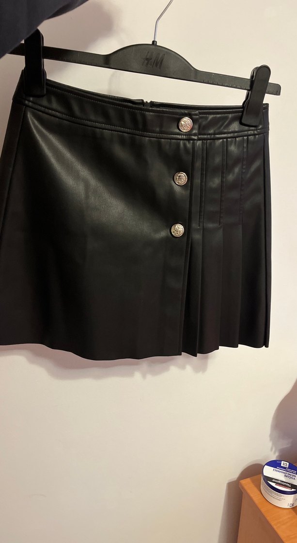 Düğmeli ve pileli detaylara sahip, siyah deri mini etek. Hiçbir sorunu yok sadece bir kez giyildi. İhtiyaç fazlası olduğundan satılık. Etek boyu çok ideal çok mini değil rahat giyiliyor.