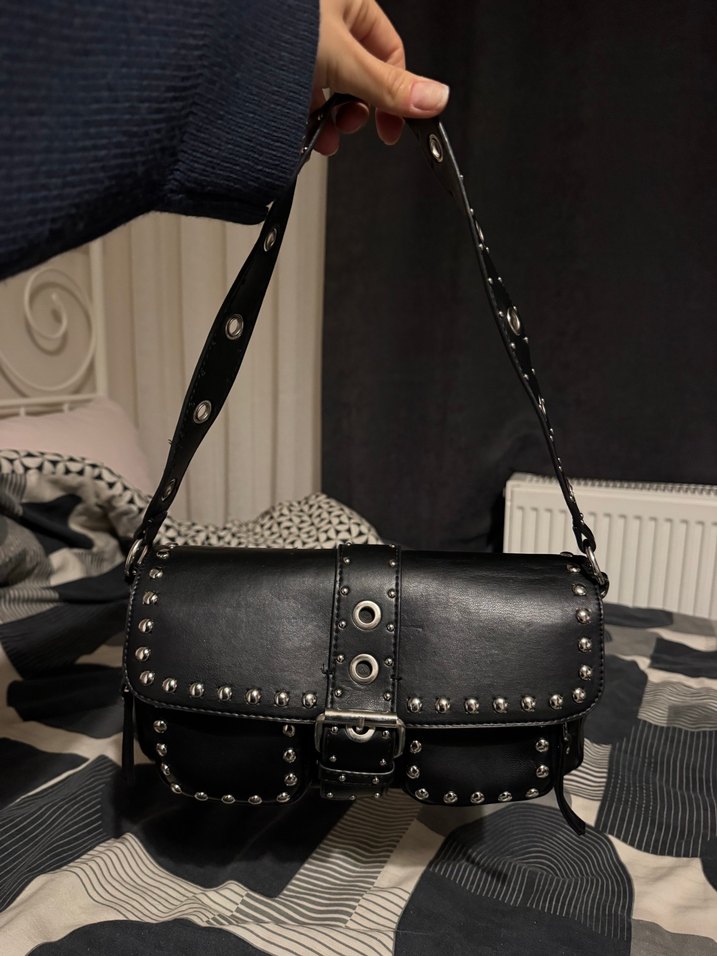 Tokalı ve perçin detaylı siyah deri çanta, gotik stil ve rock punk havası sunar. Günlük kullanım için uygundur.