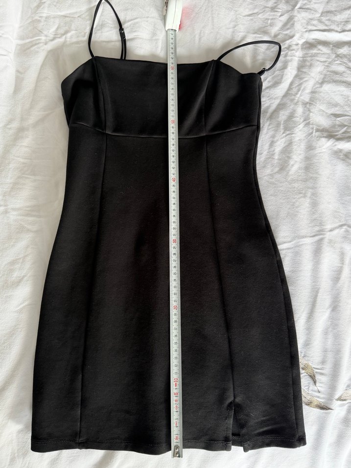 Siyah, elastik kumaştan, düz yakalı, ince askılı, mini boy, vücuda oturan kadın elbisesi. günlük kullanıma uygundur. İç göstermez kalın elastan kumaş