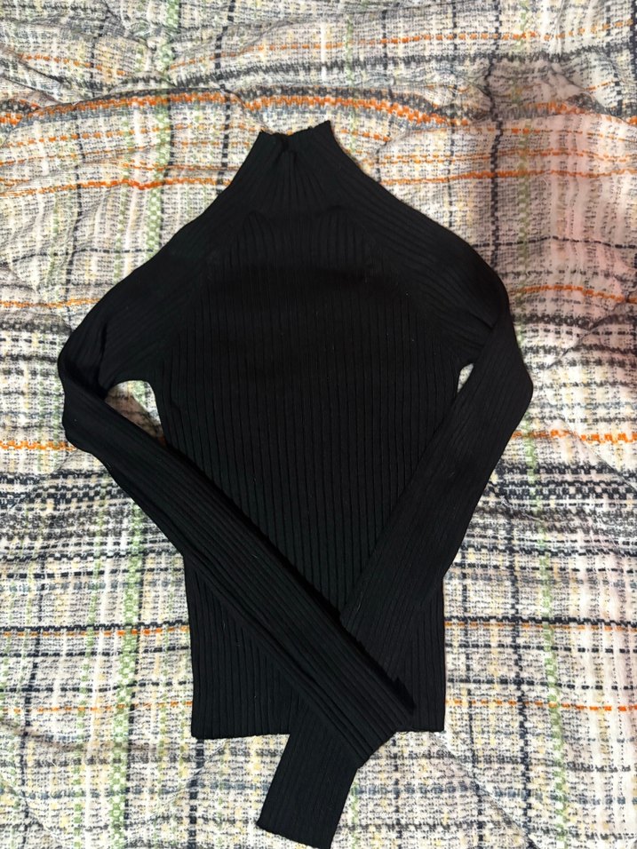 Siyah renk, boğazlı ve uzun kollu ince triko kumaştan yapılmış, vücuda oturan kadın kazak. Günlük kullanım için uygundur.