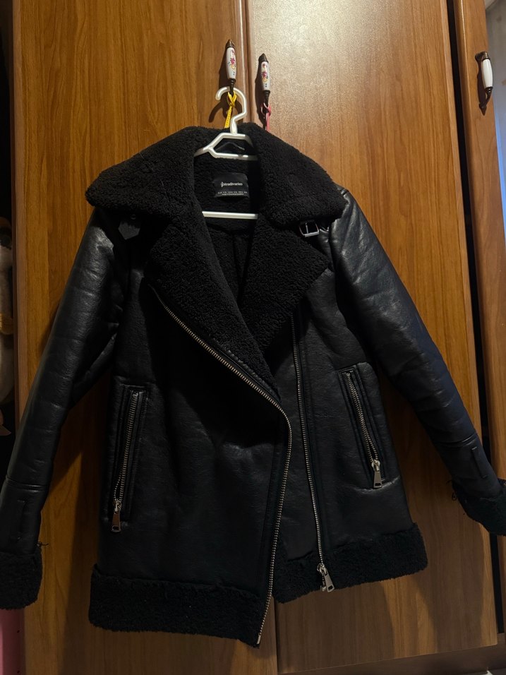 Siyah deri biker ceket, kürklü detaylı, strappy kollu ve kesik yakalıdır. Orta boy ve fermuarlı ceplidir, günlük kullanıma uygundur. Çok iyi durumda herhangi bir sorunu yok