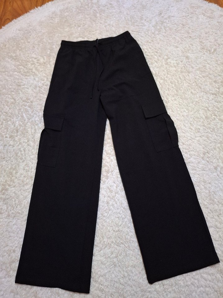 Siyah, rahat kesim, kadın pantolon. Yumuşak kumaş ve günlük kullanıma uygun. Stradivariustan alındı etiketi yok ama hiç giymedim. Bir kusuru yok s beden ama geniş.