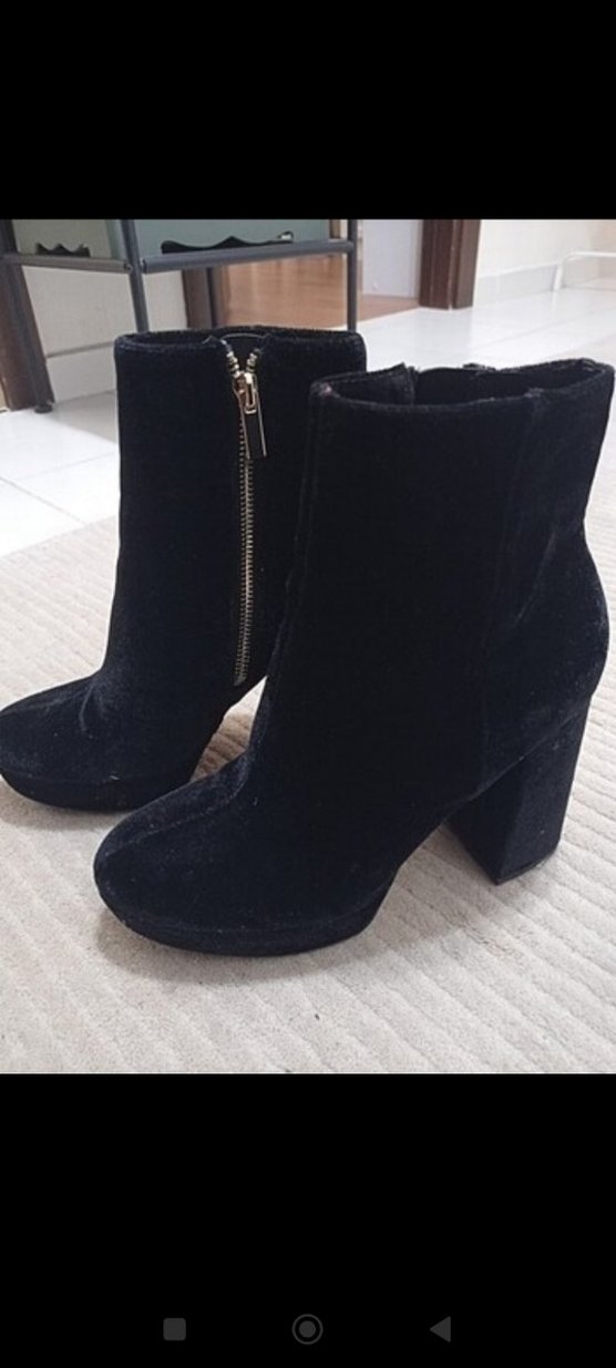 Siyah süet malzemeden fermuarlı, kalın topuklu botlar. Rahat ve gündelik gotik tarzda tasarlanmıştır.
