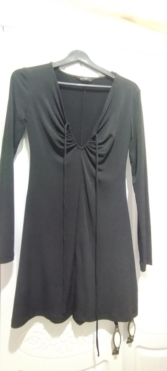 Stradivarius markalı, siyah, V yakalı, fermuarlı, sentetik kumaştan yapılmış, kısa uzunlukta ve uzun kollu elbise