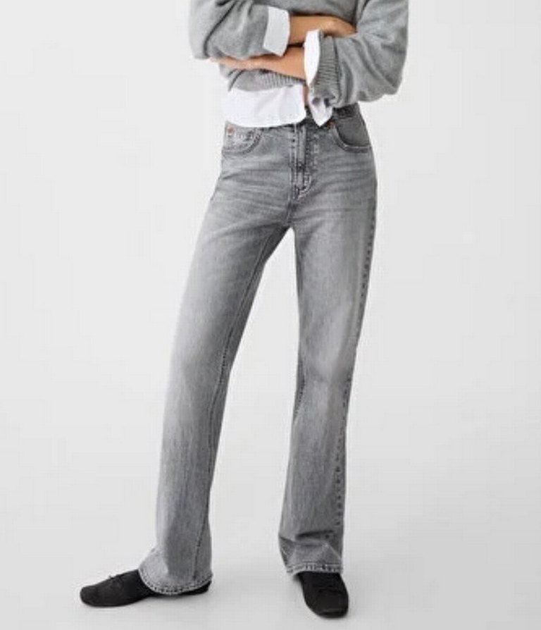 Gri kot jean, yüksek bel, düz paça 34 bedendir.