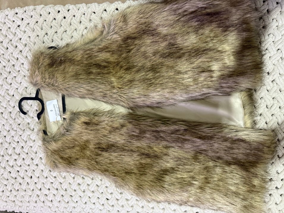 Yumuşak sentetik kumaştan, uzun ve vücuda oturan bej suni kürk yelek. Rahat ve bohem tarzda, dış mekan kullanımı için uygundur.