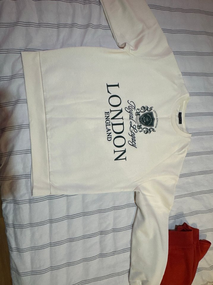 Pamuklu, uzun kollu ve yuvarlak yakalı krem sweatshirt. Geniş kesimi ve 'LONDON' baskısı ile rahat ve şık bir sokak stili sunar.