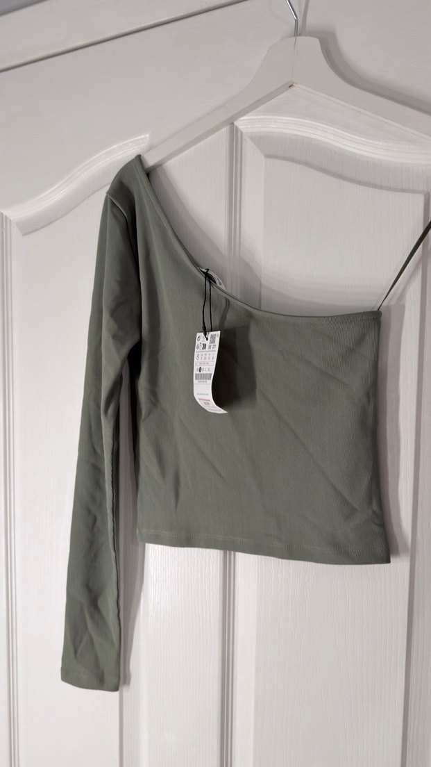 Stradivarius haki renk tek omuz bluzdur. Uzun kollu modeldir. Esnek ve ince dokumaya sahiptir. Ürün yenidir.