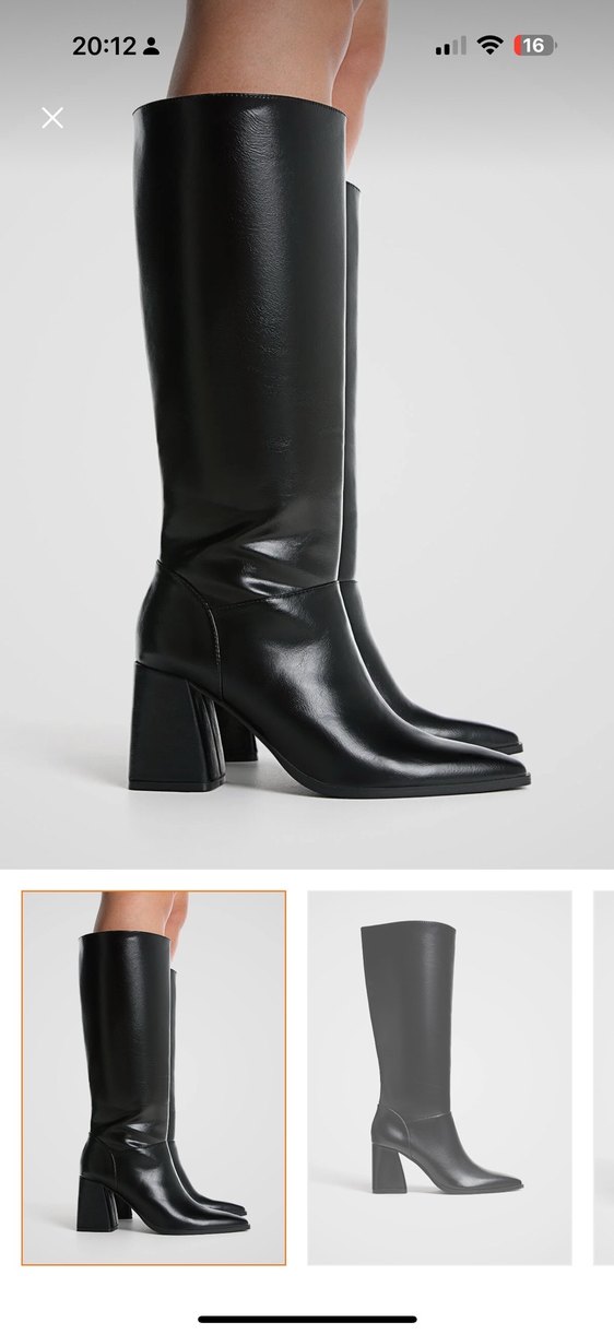 Ofis kullanımı için uygun, tokalı, blok topuklu siyah deri dizüstü çizme. Cesur ve minimalist tarzda.