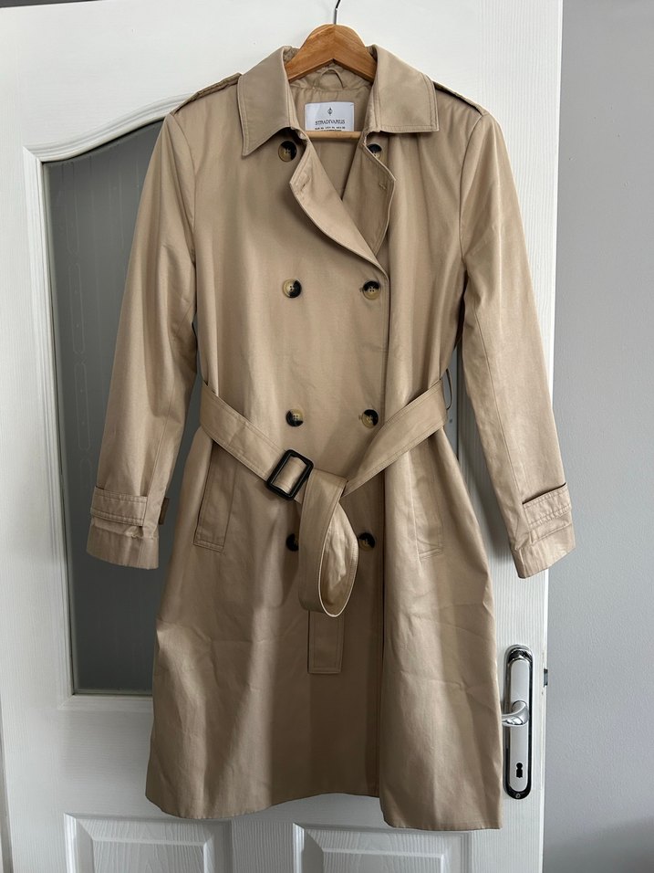 kalibi kucuk oldugu icin m-l icin daha uygun vatkali, orijinal, bej renkli, kuşaklı midi boy kadın trençkot. Yumuşak süet kumaştan, uzun kollu ve hicbir sorunu yoktur.