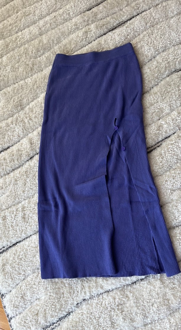 görseldekinden çok daha açık lila renginde yandan düğmeleri olan yırtmaçlı bir etek esnek ve rahat bir kumaşı var defosuz