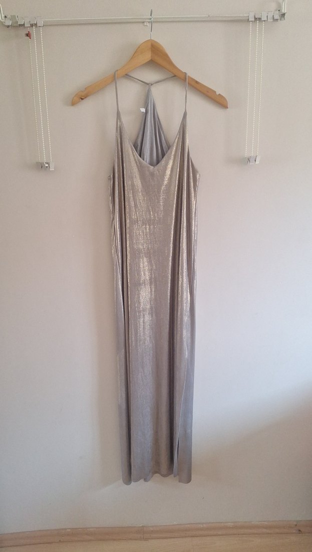 Gri renkte, uzun ve bol kesim askılı straplez yaka drapeli elbise. Minimalist ve çağdaş tarzda, parti için uygun. az kullanılmış sorunsuz üründür #stradivarius #elbise