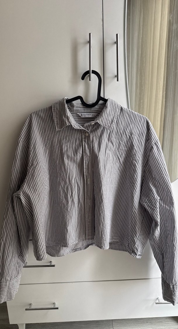 Gri çizgili, %100 pamuk kumaştan uzun kollu gömlek. Etiketi yok ama hiç kullanılmadı. Yaka ve düğmeli ön detaylı, bol kesim ve normal midi boyda, günlük kullanıma uygun. #stradi #stradivarius #inditex #gömlek #gri #grigömlek #çizgili #çizgiligömlek #shirt #griçizgiligömlek
