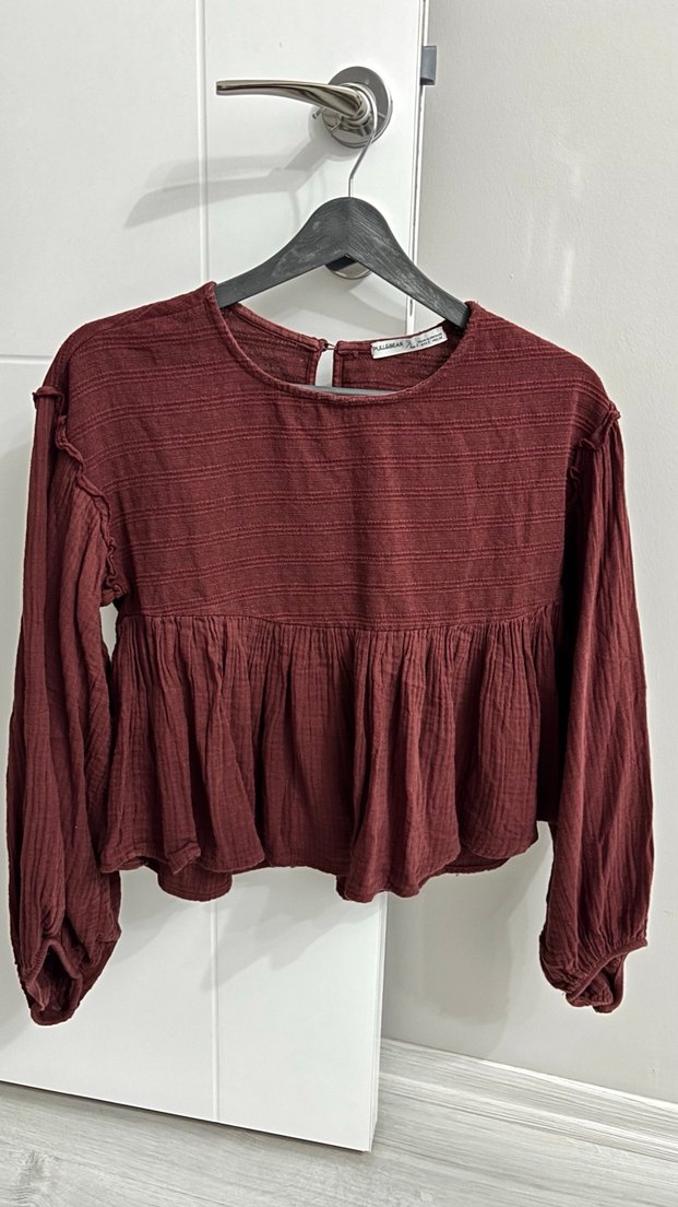 Yumuşak keten kumaştan, bordo renkli, uzun kollu ve pliseli detaylı bol kesim bluz. Yuvarlak yaka ve midi boyda, bohem tarz için uygun. Hiç bir sorunu yok
