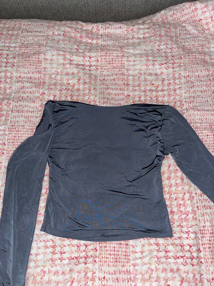 Uzun kollu, sırt dekolteli, yumuşak sentetik kumaştan yapılmış fit kesim gri bluz. Günlük sokak giyimi için uygundur. ️