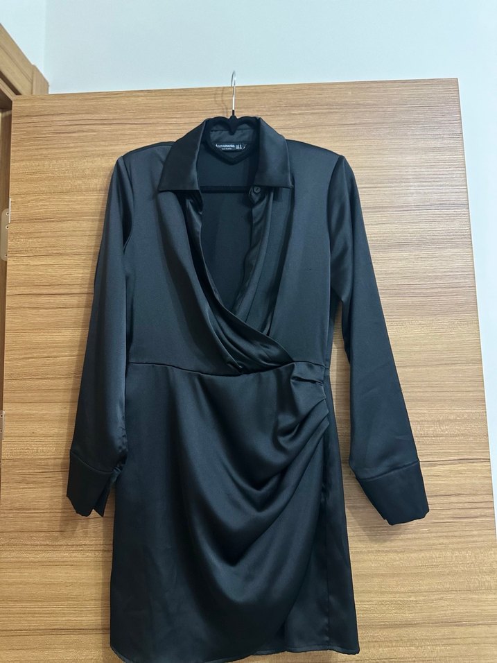 stradivarius Uzun Kollu, V Yakalı Siyah Kadın Elbise