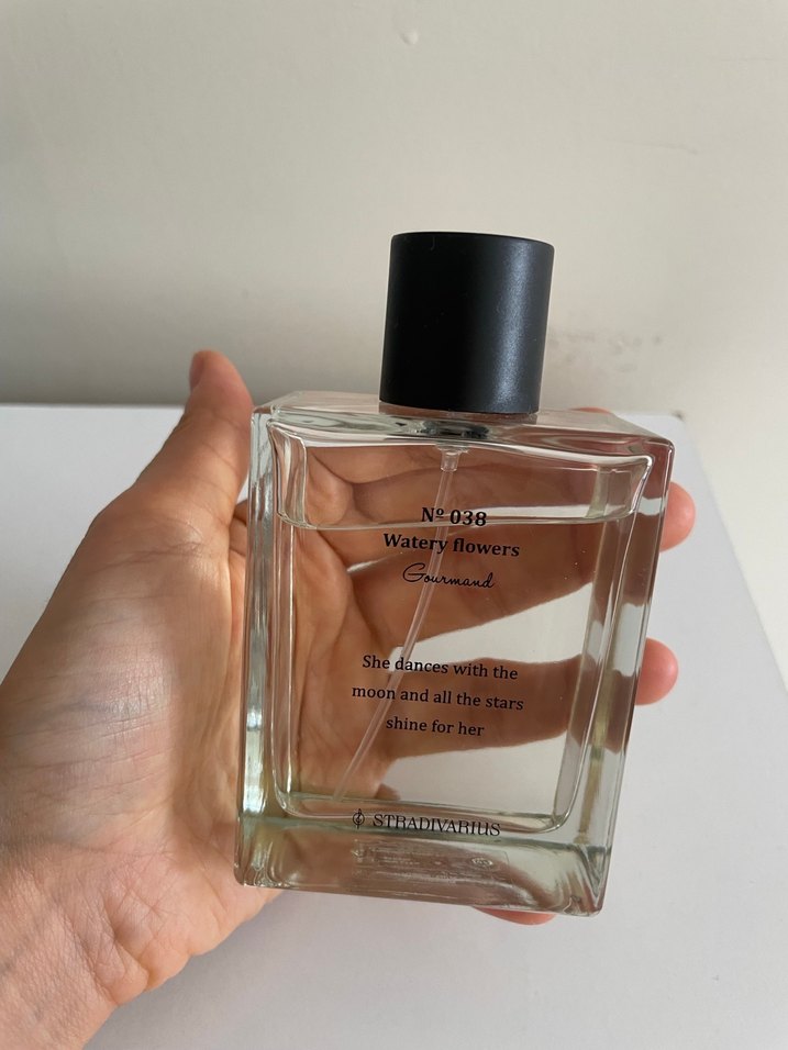 Stradivarius Watery Flowers parfümü, siyah kapaklı şeffaf cam şişede sunuluyor. Ay ve yıldızlarla dans eden, ona parlaklık katan bir koku. Parfüm numarası 038. Hiç kullanılmadı etiketli