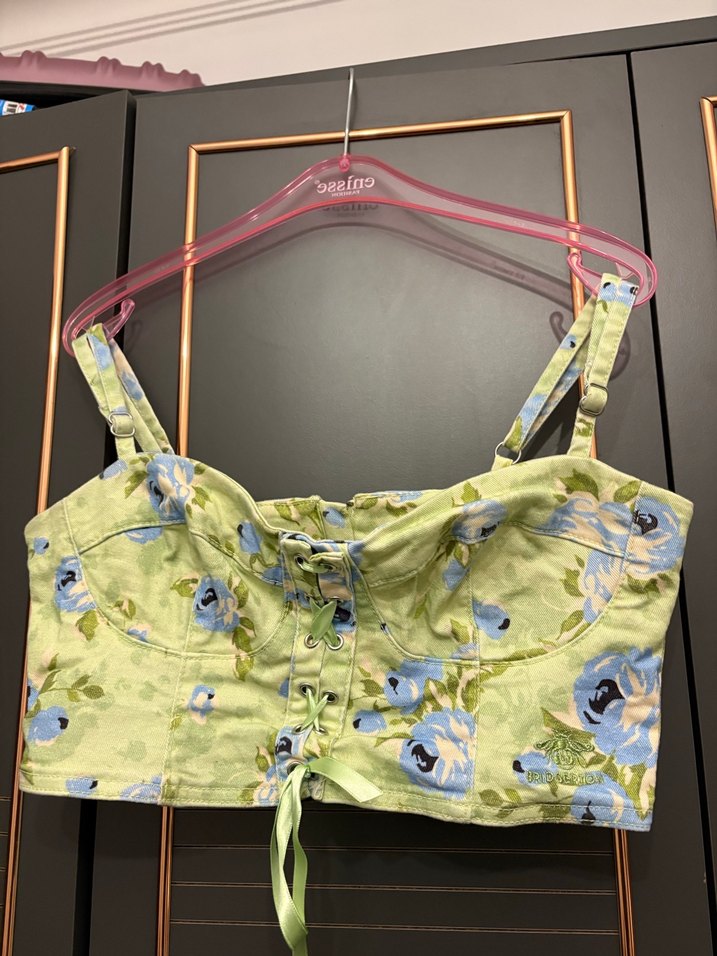 Yeşil bağcıklı ve düğmeli mini büstiyer, askılı ve straplez yakalıdır.