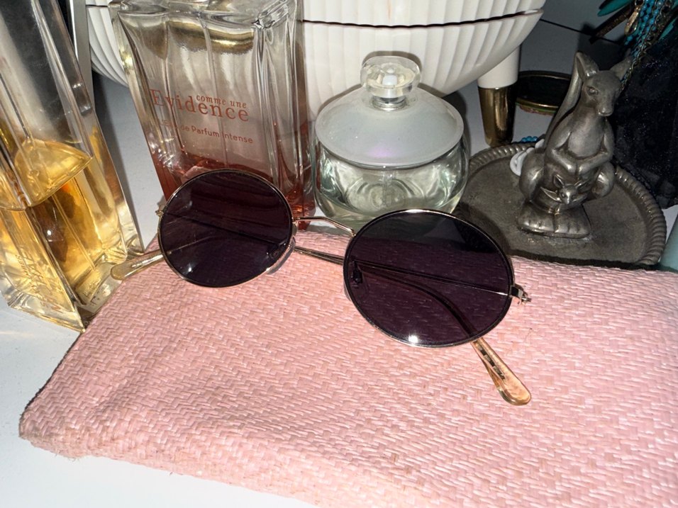 Yuvarlak çerçeveli ince güneş gözlüğü. Camları siyah renk.Çok az kullanıldı çizik kırık yok.
