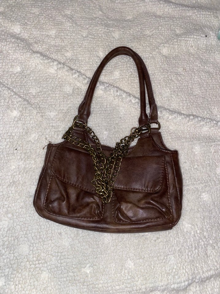 kahverengi deri kadın çanta, zincir detaylı ve çift saplı. Düz yüzeye sahip, günlük kullanıma uygun, trend bir tarz sunar. Hiçbir sorunu yoktur
