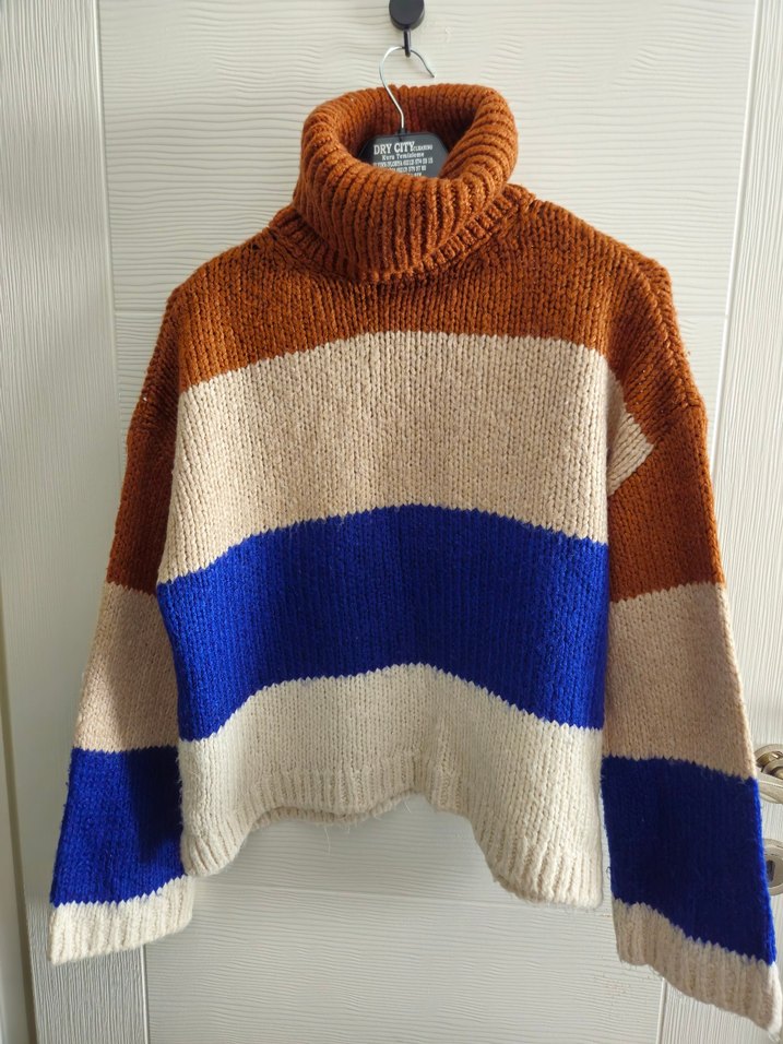 Sorunsuzdur. Sicak tutuyor. Boğazlı, uzun kollu, bol kesim, çok renkli çizgili triko kazak.
