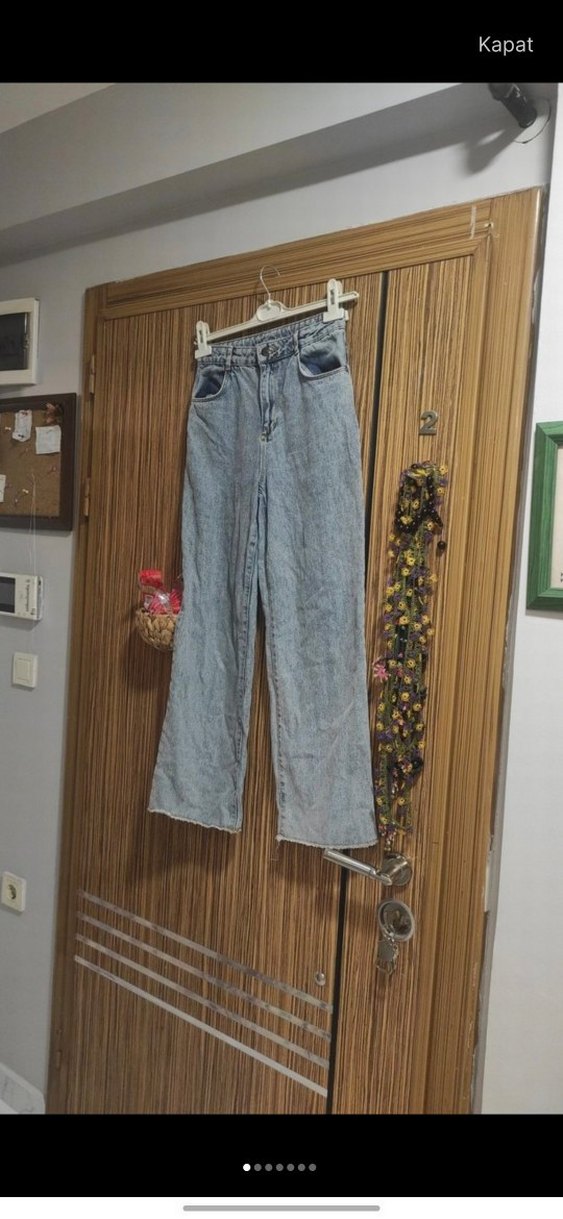Düğmeli, bol kesim, midi boy mavi batik desenli denim kadın jean. Günlük sokak stili için uygundur.