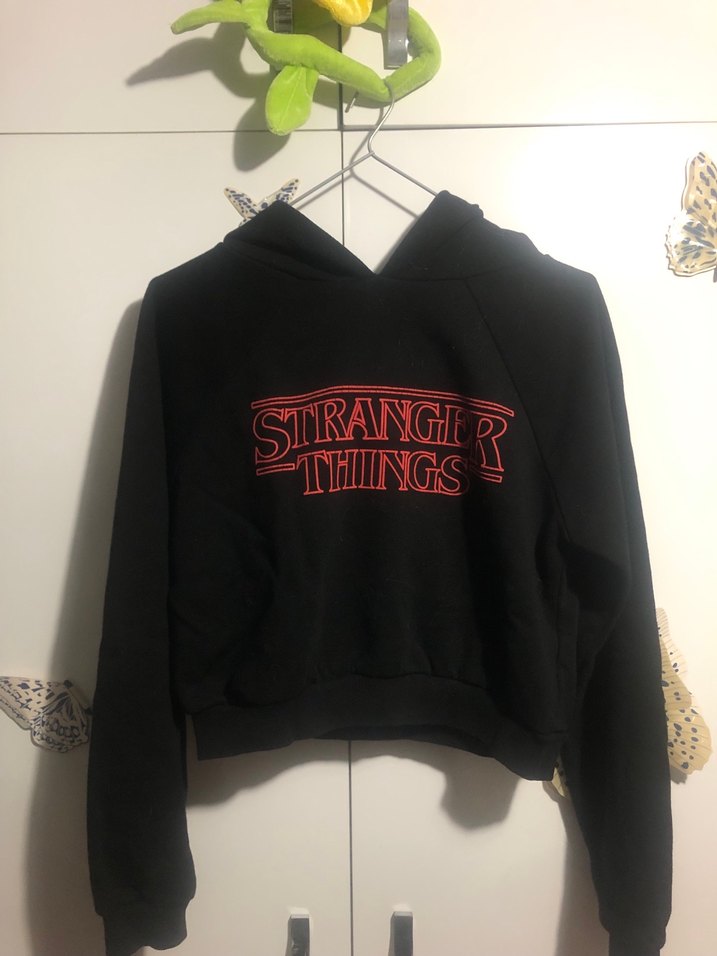 Siyah, Stranger Things baskılı, uzun kollu, bisiklet yaka ve tokalı detaylı fitted sweatshirt. Günlük sokak stiline uygun. Baskısında biraz kırılma var