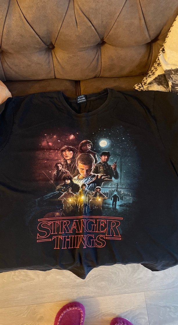 Siyah, kısa Stranger Things baskılı, yuvarlak yaka, rock punk havasında