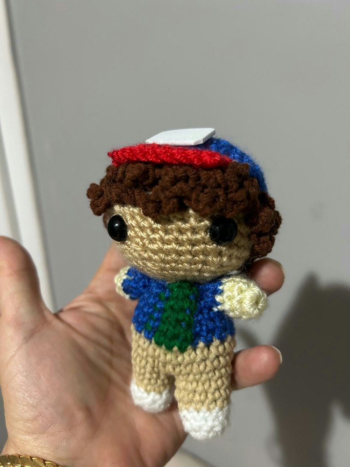 Yumuşak iplikle yapılmış, detaylı özelliklere sahip renkli el örgüsü oyuncak bebek.