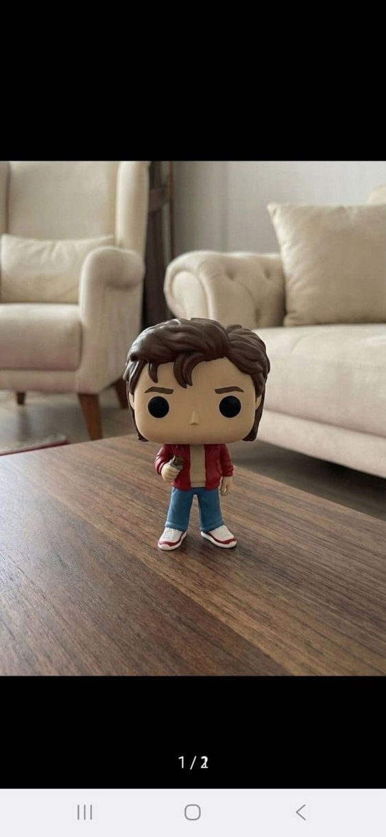 Kahverengi saçlı, kırmızı ceketli ve mavi pantolonlu figür, ahşap yüzeyde duruyor. renksiz fiyatı 200 renkli 500