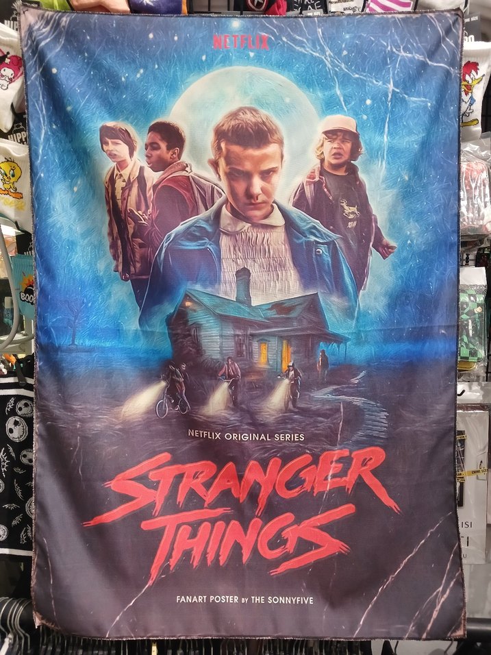 Netflix orijinal dizisi Stranger Things'in ana karakterlerinin yer aldığı fanart poster, gizemli bir arka plan ve parlayan ay ile ev tasviri içerir. 70x100 cm