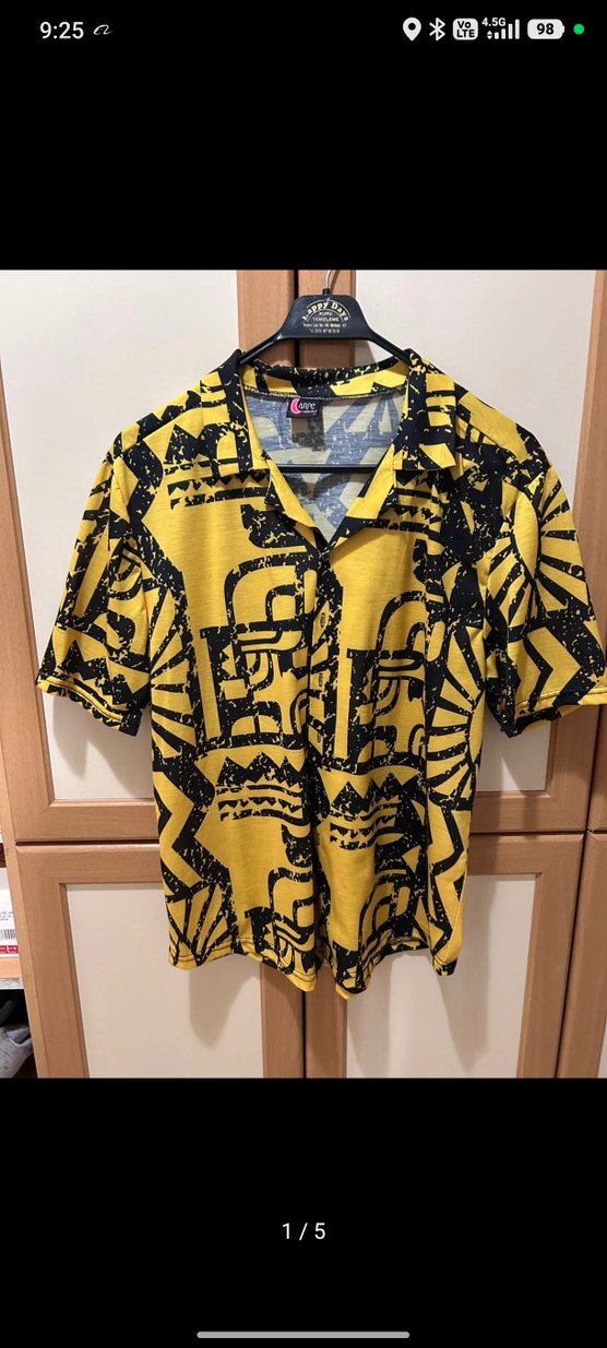 Sarı renkli, kısa kollu, bol kesim erkek gömlek. Siyah desenlerle süslenmiş, yakalı ve düğmeli, yumuşak dokulu kumaştan üretilmiştir.