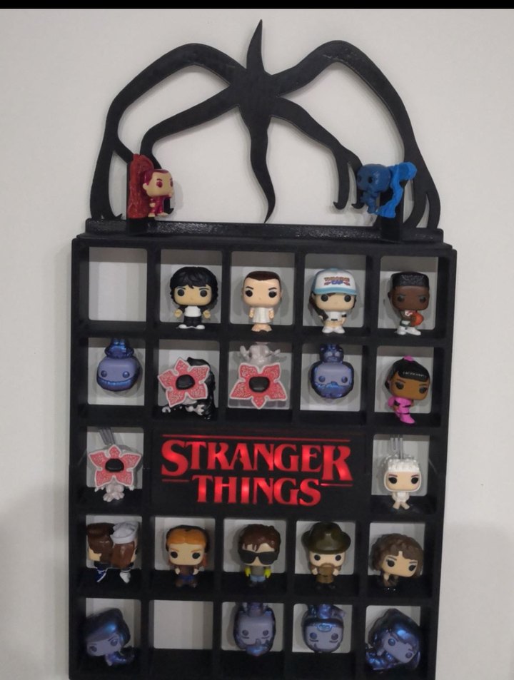 Stranger Things temalı, karanlık renklerde çoklu aksiyon figürlerinden oluşan set. Siyah raf ve figürlerle sergilenmiştir. ♂️