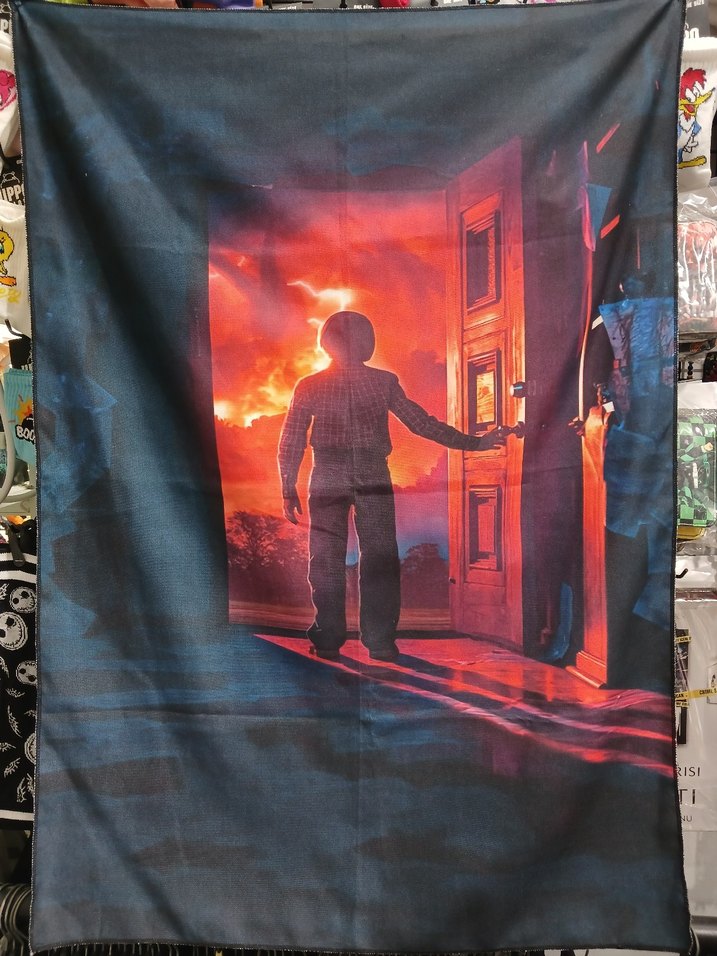 Koyu gri renkte, baskılı karşı kültür desenli perde. Kapı önünde duran kişinin olduğu dramatik ve yoğun bir atmosfer yaratıyor. ️70x100 cm