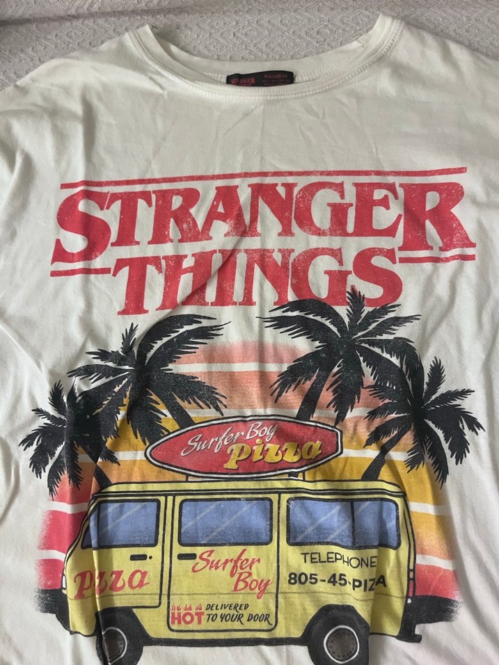 Yumuşak kumaştan, bol kesim baskılı tişört.Üzerinde vintage minibüs, palmiye ağaçları ve 'Stranger Things' yazısı bulunur.