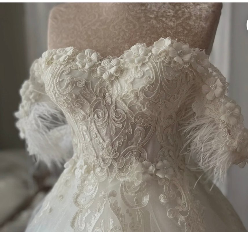 Uzun, vücuda oturan beyaz gelinlik, straplez yakası ve zarif çiçekli dantel detaylarıyla modern klasik ve vintage tarzı bir araya getiriyor. gelin çiçeği duvak taç ve tarlatan ile birlikte verilecektir hiç giyilmemiştir