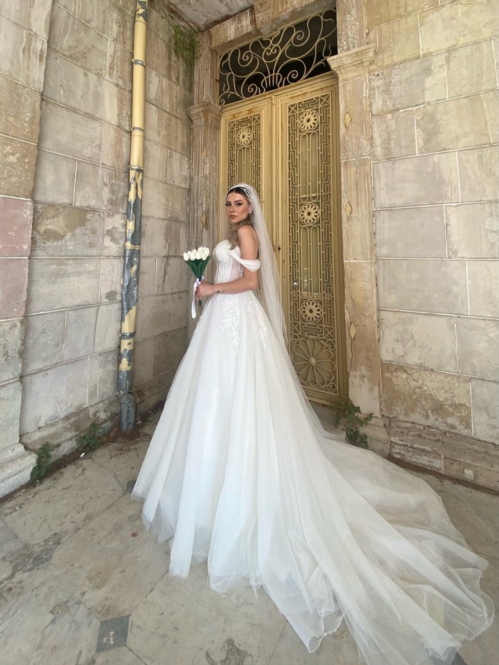 Straplez beyaz gelinlik, uzun ve bol kesimdir. Modern klasik tarzıyla klasik zarafeti ve ışıltılı bir dokunuşu bir araya getirir. Kolsuz yapısıyla hafif ve şık bir görünüm sunar.