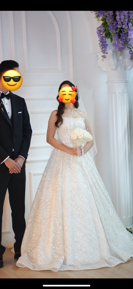 Bursa da olan varsa deneyebilir. Herhangi bir lekesi vs yok. Tertemiz. Straplez yakalı, ince oturan ve uzun etekli beyaz A kesim gelinlik. Kolsuz ve modern klasik stilde, göz alıcı bir tasarım sunar. Gelinliğimin rengi kırık beyaz gibi. Gelinlik + tarlatan birlikte göndereceğim. Full taş işlemeli. Düşer diye endişelenmeyin bayağı güzel oturuyor. Ağır değil ben düğün boyunca oynadım 1.60 boyundayim 13 cm topuklu giydim eşim 1.90 olduğu için. 1.73 biri giymiş gibi düşünün. Uzunluğunu kendinize göre ayarlayabilirsiniz.  Beğenmezseniz iade edebilirsiniz. Ben 60.000 e aldım. Bu yıl evlendim.