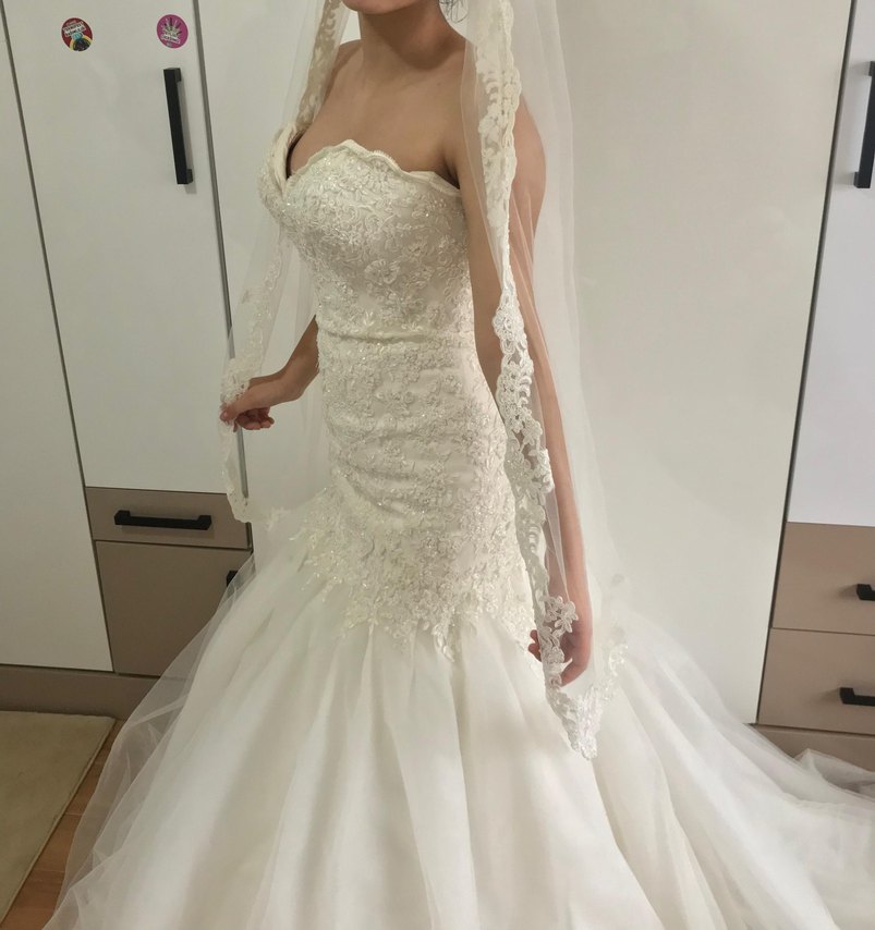 Beyaz straplez gelinlik, detaylı dantel işlemeli oturan üst kısmı ve A kesim midi etek ile klasik ve göz alıcı bir görünüm sunar. Kollu değildir. Kuru temizlemeye verilmedi. Model boy 160 kilo 57. Duvak dahildir. İsteyene fiyatta indirim yapabilirim.