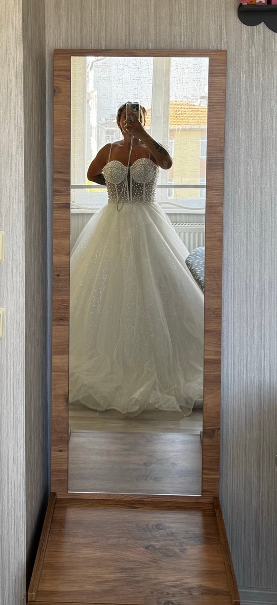 Bu straplez, strappy kollu ve vücuda oturan A kesim gelinlik, uzun boyu ve modern klasik tarzıyla göz alıcı bir şıklık sunar. Hafif beyaz rengi ile zarif bir duruş sağlar. 38.40.42bedene kadar olur göğsü b ve c cuplara uygundur hiç giyilmedi kolları ve duvağı mevcuttur. Gelib evdende ala bilirsiniz